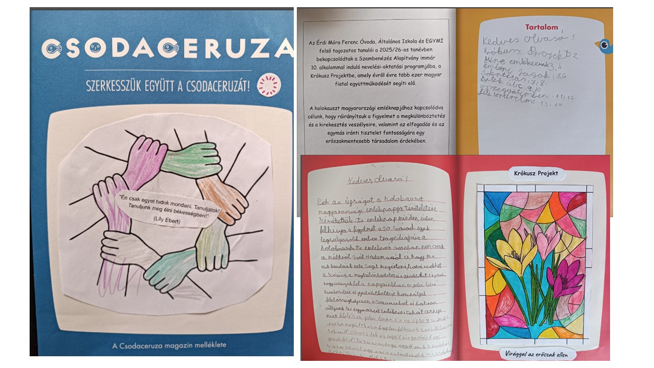 A holokauszt magyarországi emléknapja április 16-án, csütörtökön lesz. A programot egy hosszas felkészülés előzte meg: Vida Nárcisz projekt vezető kollégánk szervezésében a Krókusz Projekt részeként több alkalomból álló eseménysorozat zajlott. Ennek része volt a virágültetés, egy meghívott szervezet interaktív foglalkozása az identitásról és sokszínűségről, majd az ötletek megvalósítása, az újságkészítés. Ehhez magazinszerkesztői workshopon vett rész a kolléganőnk a Csodaceruzánál, majd több csoportos és néhány egyéni foglalkozás keretében ezen anyagok felhasználásával a diákok megalkották az újságokat. A tanulói munkát erre a linkre kattintva lehet megtekinteni.